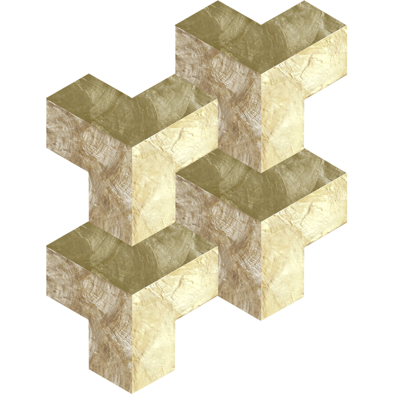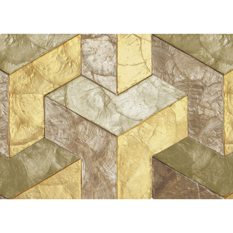 Elke strook van dit behang is een kunstwerk op zich. De capiz-schelpen, een natuurproduct, worden met de hand gekleurd, zorgvuldig versneden en in een verfijnd geometrisch helix-patroon ingelegd. Het resultaat is een adembenemende diepte en textuur die het licht op een unieke manier vangt en weerkaatst.