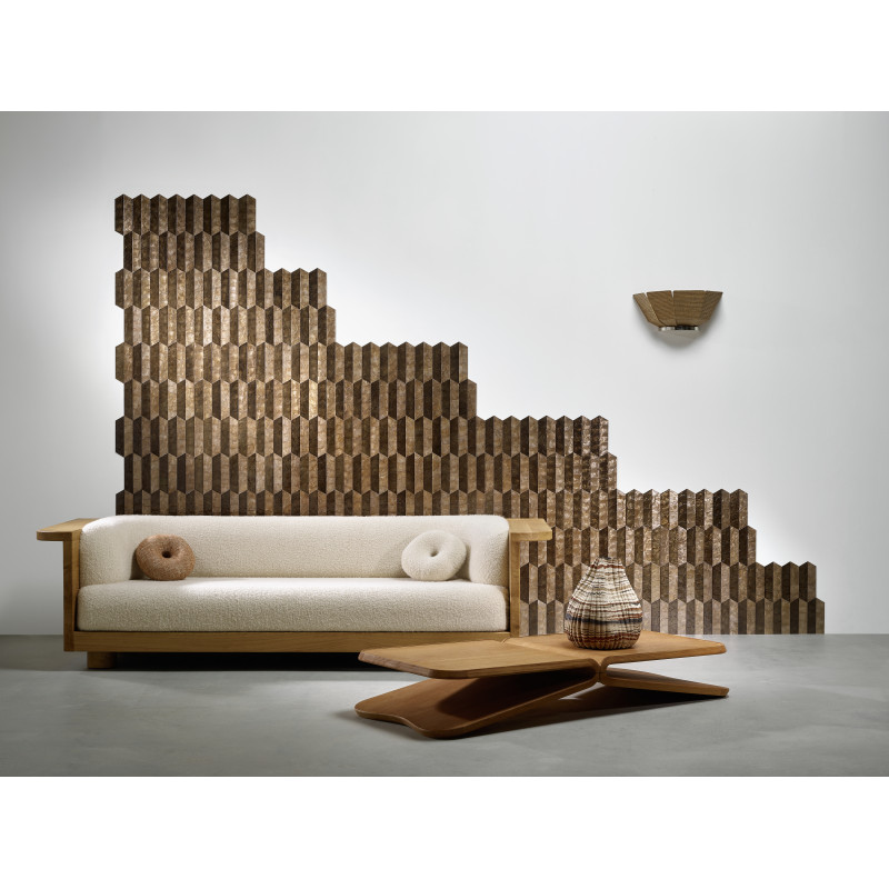 Breng de unieke schoonheid van de Filipijnen in huis met het Samal Prisma behang van Arte. Dit exclusieve behang, in de warme tint 'Hot Chocolate', is geïnspireerd op het eiland Samal, bekend om zijn natuurlijke capiz schelpen. Elke schelp wordt met de hand gekleurd, versneden en in geometrische patronen ingelegd, wat resulteert in een adembenemend natuurproduct vol textuur en diepte.