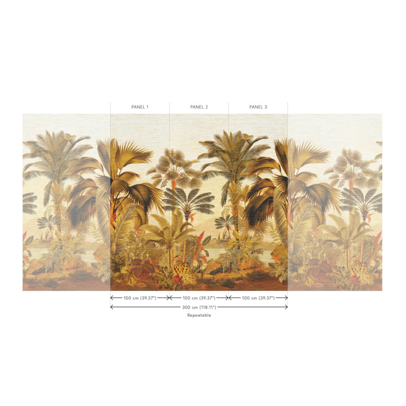 Het patroon 'Rêverie Tropicale' in de warme 'Golden Hour' uitvoering vangt het magische licht van de late namiddagzon. Het ontwerp toont een subtiele, artistieke weergave van gewoven grassen en natuurlijke vezels, wat zorgt voor een diepe textuur en een rustgevende, organische sfeer. Dit behang past perfect in interieurs met een landelijke, moderne of vintage uitstraling en voegt een uniek kunstzinnig element toe.