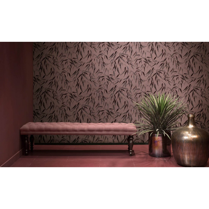 Het ontwerp toont een elegante takken- en bamboestructuur, uitgevoerd in warme, aardse tinten. Het bijzondere aan dit behang is de subtiele toepassing van flock op een selectie van de blaadjes. Deze fluweelachtige afwerking voegt een tastbare diepte en een rijk textuureffect toe, wat zorgt voor een exclusieve en weelderige sfeer in uw interieur.