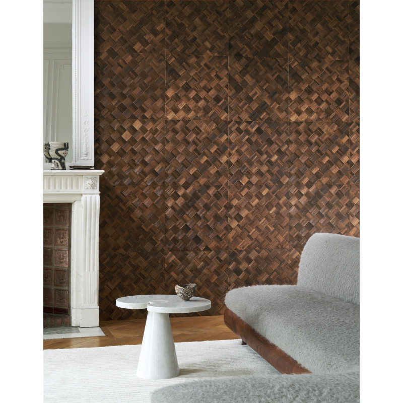| Opmerking | Muurbekleding in tegelvorm vervaardigd van schors van de bananenboom, handmatig geweven in een dambordpatroon |