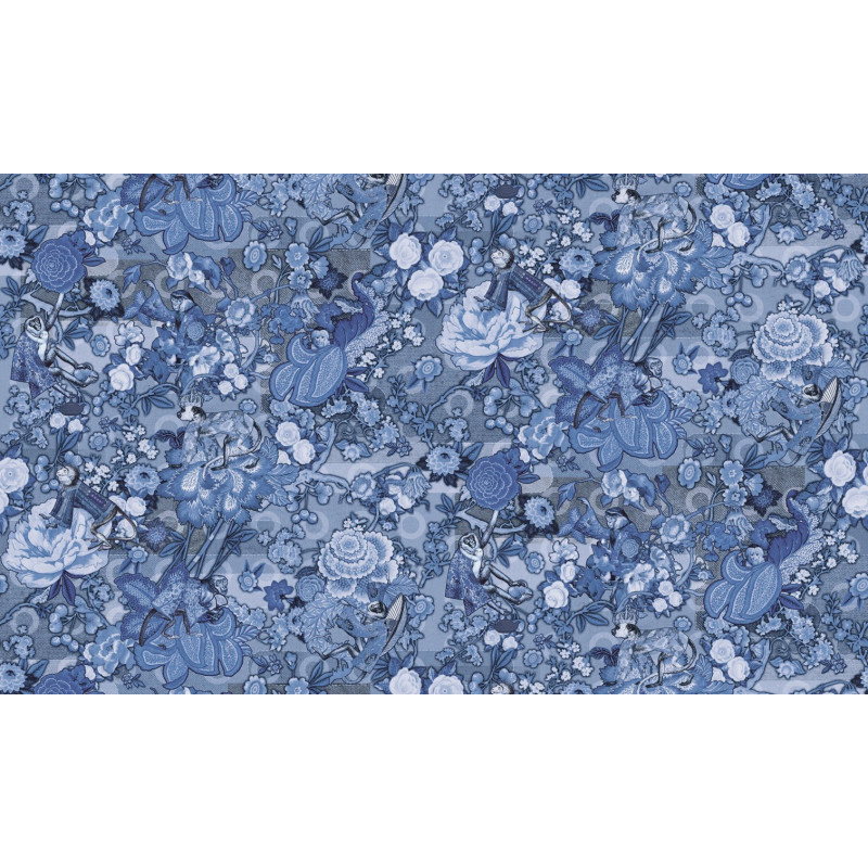 Transformeer uw ruimte met dit adembenemende designer behang van Moooi. Het Tokyo Blue Rendezvous patroon combineert oosterse elegantie met een moderne, artistieke twist. De diepe Ming Blue tint, geïnspireerd op klassieke jeans, vormt een tijdloze achtergrond voor een speelse compositie van bloemen en dierenprints.