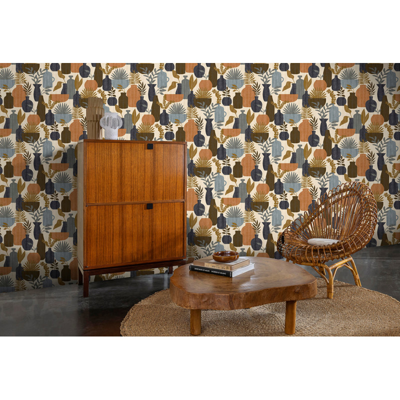 Het Alegria Manaus behang vraagt om een rustige inrichting. Combineer het met effen, lichte meubels in eikenhout of wit. Kies accessoires in dezelfde warme aardetinten als het behang, zoals een terracotta kan of een mosterdgele theedoek. Koperen of zwarte details in verlichting en kranen geven een extra moderne touch. Voor een harmonieus geheel kunt u één accentmuur behangen en de andere muren in een effen, bijpassende kleur schilderen.
