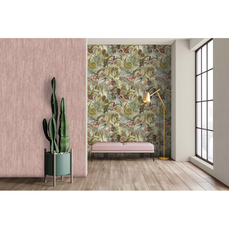 Combineer dit kleurrijke behang met lichte, natuurlijke materialen zoals rotan, hout en katoen. Kies voor meubels in neutrale tinten (wit, beige, lichtgrijs) om het kunstwerk op de muur volledig tot zijn recht te laten komen. Een paar groene planten completeren het tropische gevoel.