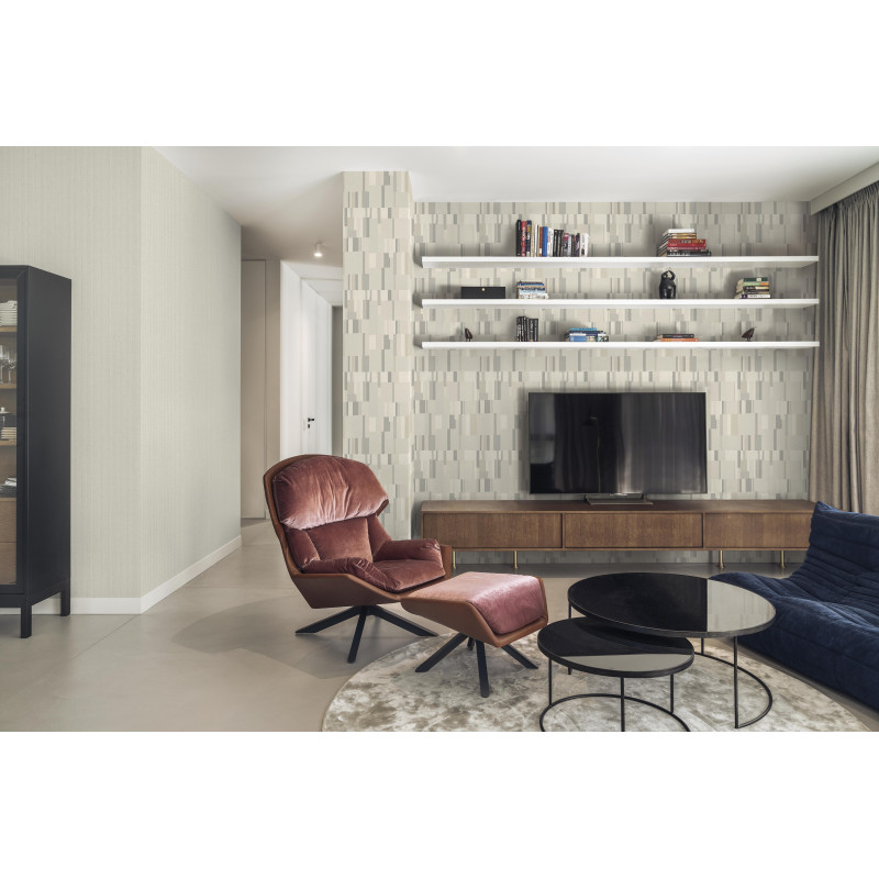 Het ontwerp toont een subtiel patroon van overlappende vierkanten en strepen, geïnspireerd op traditionele geschilderde muurdecoraties. Het resultaat is een diepgaand visueel effect dat karakter en diepte aan elke ruimte toevoegt.