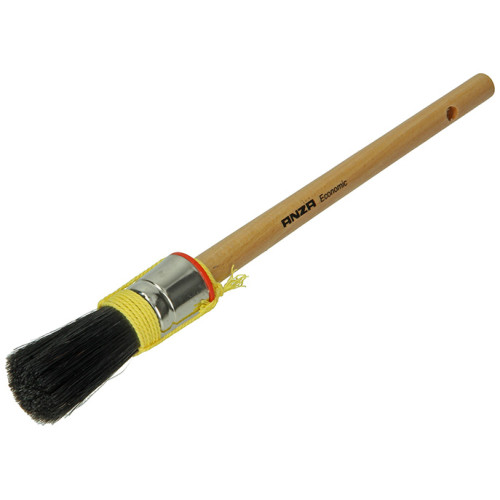 Dit is een iets meer voordelige doch hoogwaardige kwast voor alkyd lakken en heeft een mix van zwart varkenshaar en synthetische vezels, plus touwwoeling. Is voorzien van een vernikkelde bus en de geverniste steel is bevestigd d.m.v. een plastiek kapje. Geschikt voor alle synthetische lakken/verven.