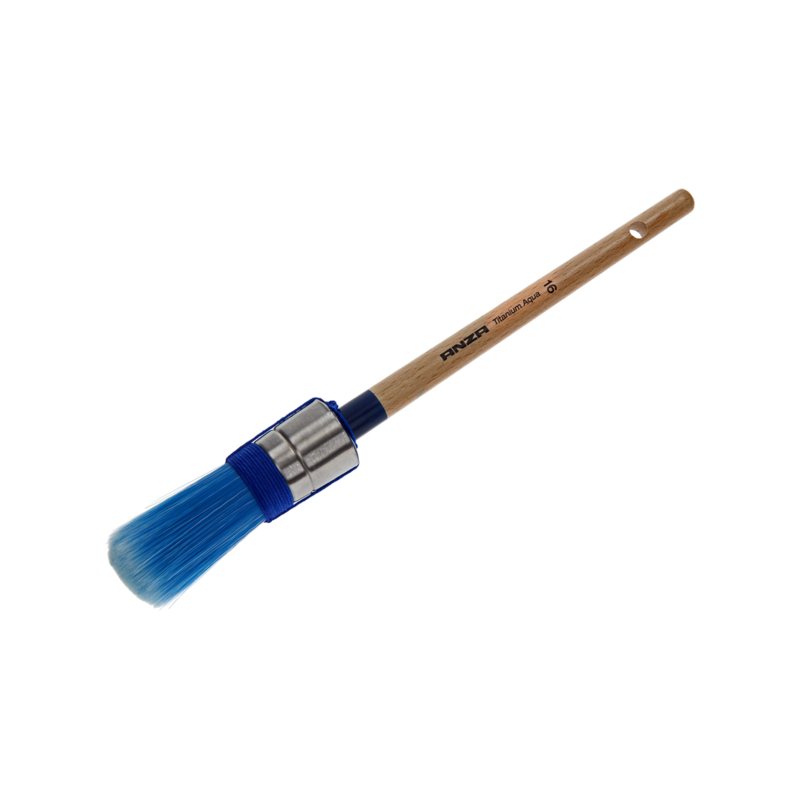 Anza Titanium Aqua Kwast Rond Serie 720 is een ronde kwast met mix van synthetische vezel haren, rvs/inox ring een volgekitte en geverniste houten steel. Ideaal voor het verwerken van watergedragen oftewel acrylverf. Denk hierbij aan beits, vernis, lak of grondverf.