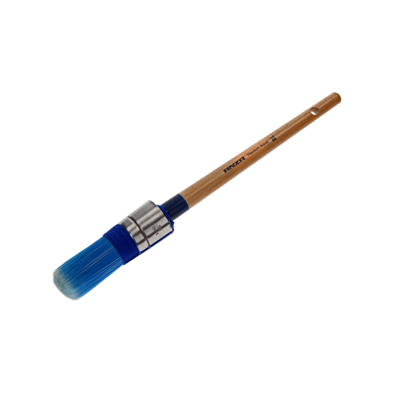 Anza Titanium Aqua Kwast Rond Serie 720 is een ronde kwast met mix van synthetische vezel haren, rvs/inox ring een volgekitte en geverniste houten steel. Ideaal voor het verwerken van watergedragen oftewel acrylverf. Denk hierbij aan beits, vernis, lak of grondverf.
