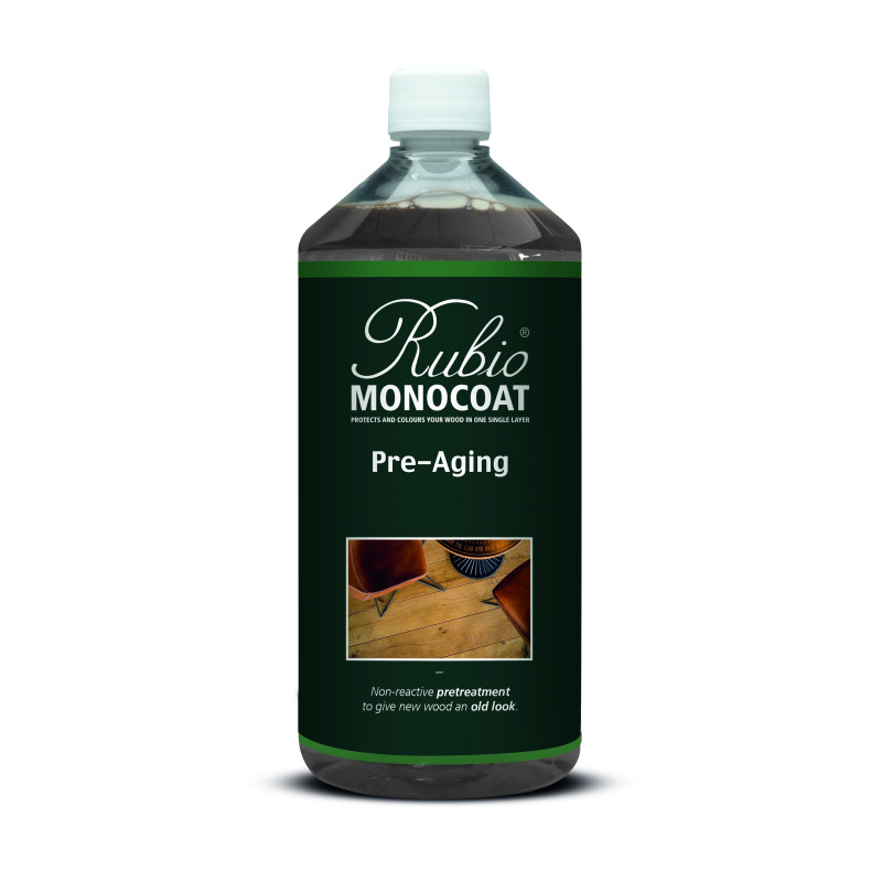 Rubio Monocoat Pre-Aging is een niet-reactieve voorbehandeling van hoge kwaliteit, beschikbaar in 10 standaard kleuren. Het kleurengamma gaat enerzijds van een lichtere naar donkere gerookte look, waarbij de kleuren onderling mengbaar zijn en ook afgelengd kunnen worden tot de variant die de klant wenst. Anderzijds is er een gamma vergrijsde kleuren die ook onderling mengbaar zijn. Het resultaat geeft een diepe kleuring met subtiele accenten.