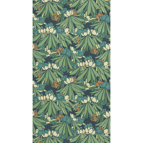 Het behang toont een sierlijke tak van een rododendron, gedetailleerd weergegeven met zijn karakteristieke bladeren en bloemknoppen. Het ontwerp balanceert tussen retro charme en hedendaagse verfijning, waardoor het veelzijdig inzetbaar is.